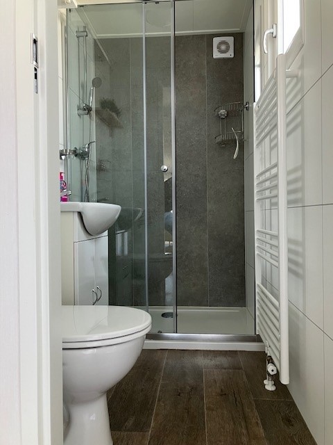 Ruime douche met toilet.